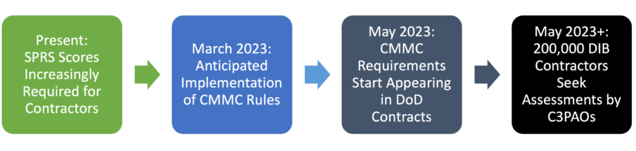 Even now, absent formal CMMC requirements in DoD contracts, a number of contractors are finding for the first time that their contracts require the submission of Supplier Performance Risk System (SPRS) scores – essentially a self-evaluation of the same NIST 800-171 requirements that appear in the CMMC.